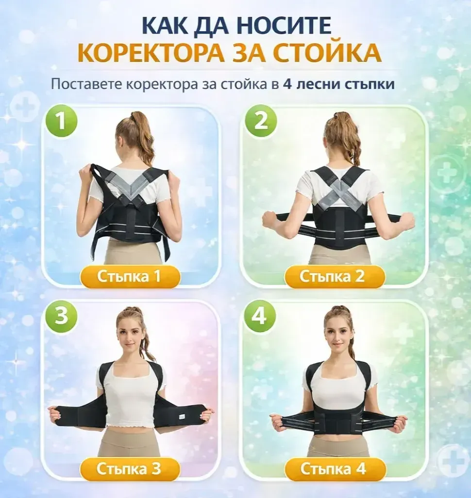 Разполага с кръстосани каишки, които стягат гърба и раменете, принуждавайки раменните прешлени да се изправят назад и изправяйки талията и гърба.